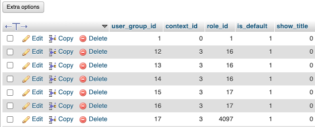 Masuk ke phpMyAdmin atau tools yang serupa lalu pilih database OJS > user_groups.
