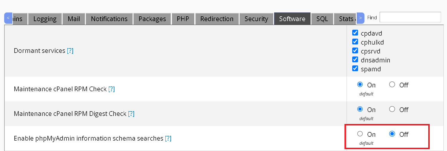 Pilih tab Software lalu set Off Enable phpMyAdmin information schema searches.